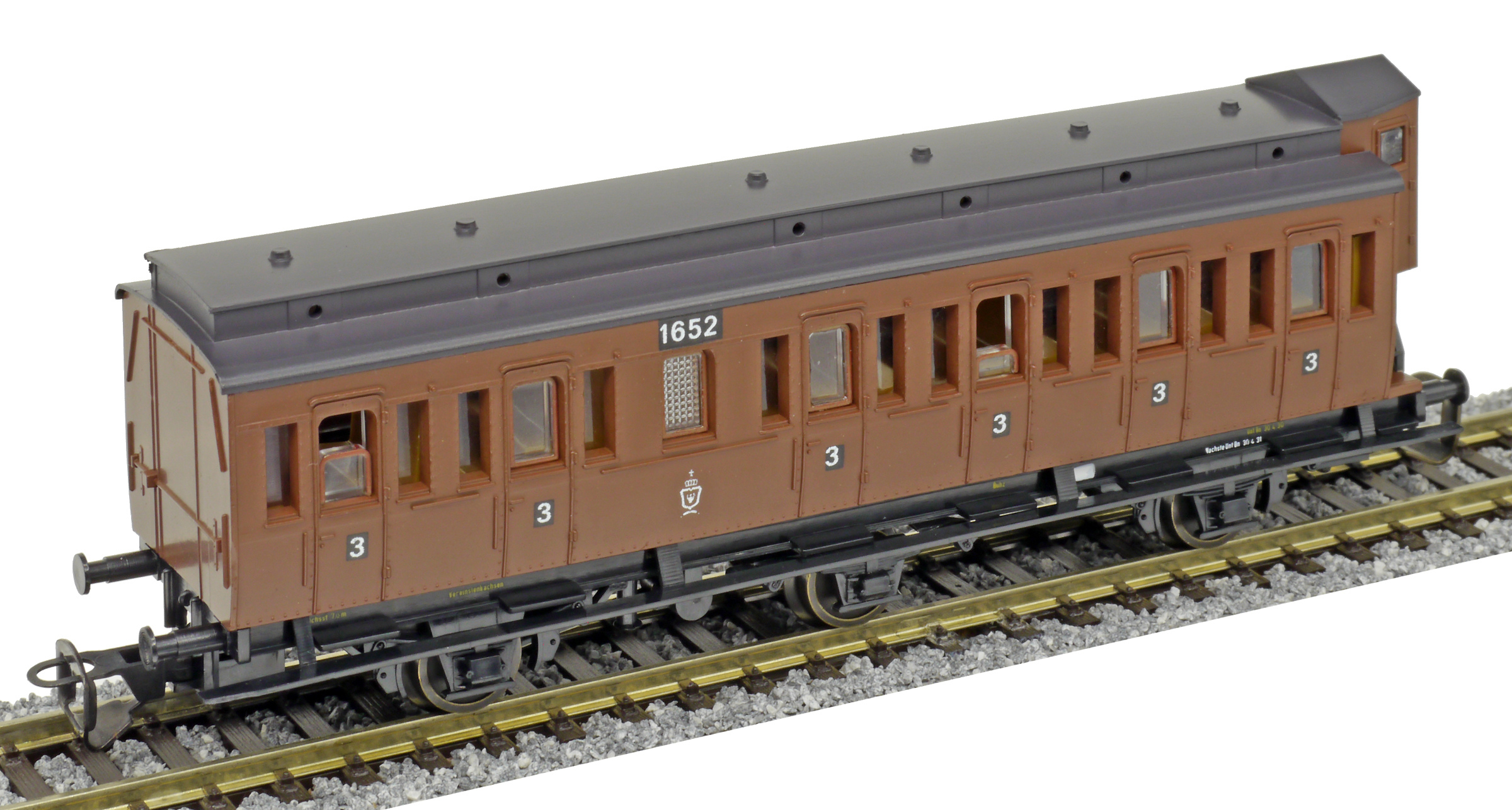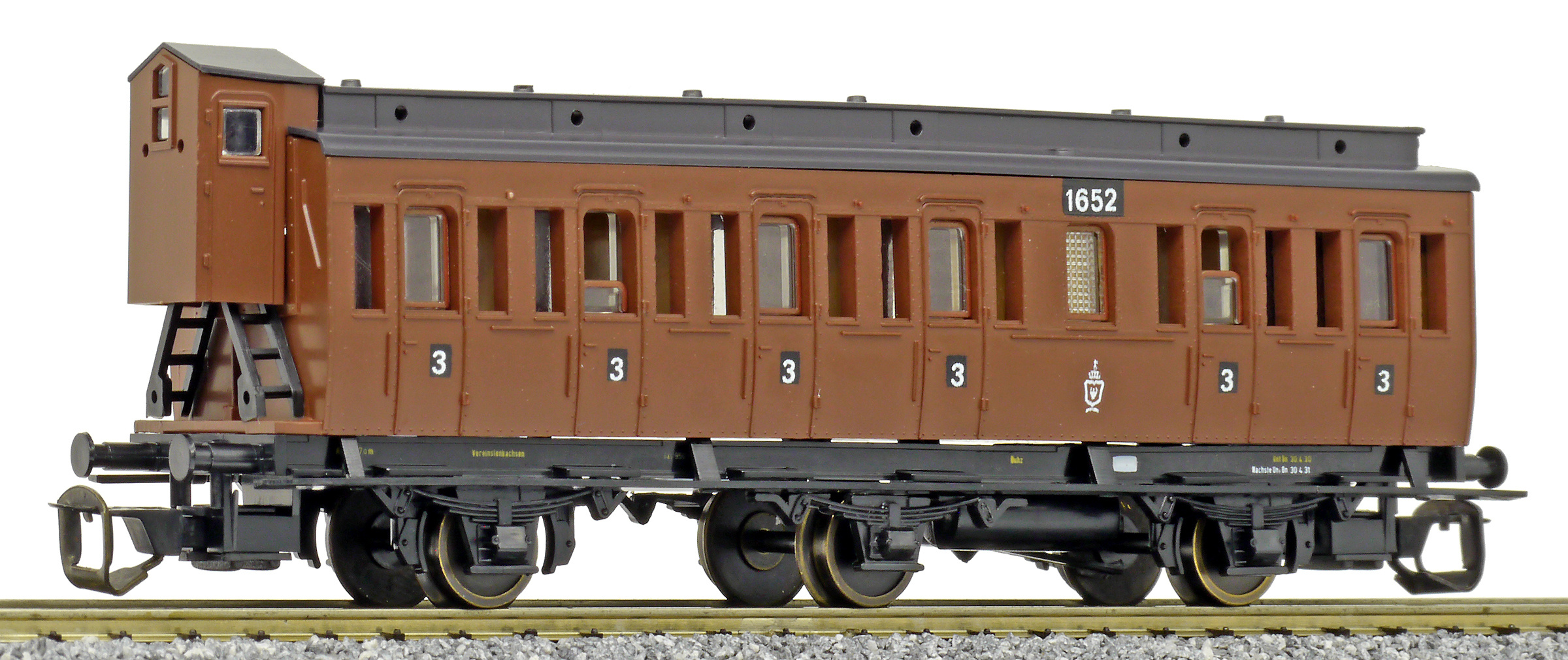 oddílový osobní vůz červený s černou střechou a s brzdařskou budkou 3. tř.