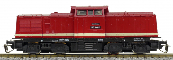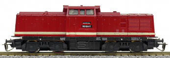 | dieselová lokomotiva červená s bílým pruhem, černým rámem a podvozky |