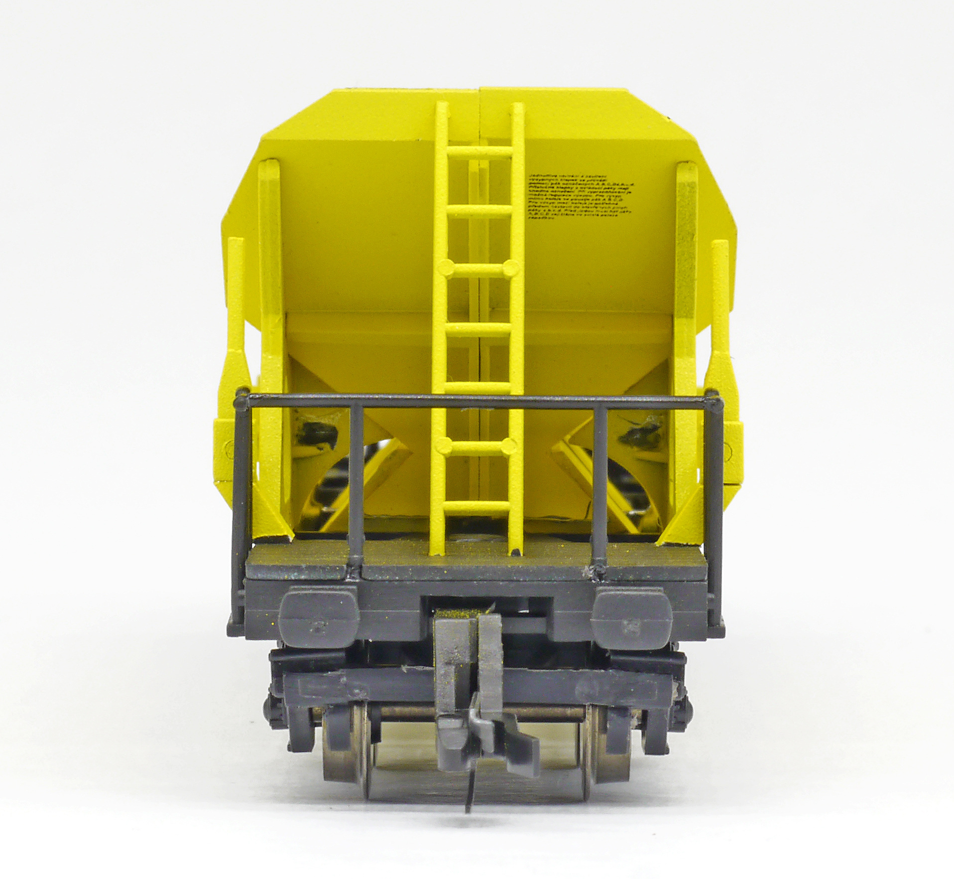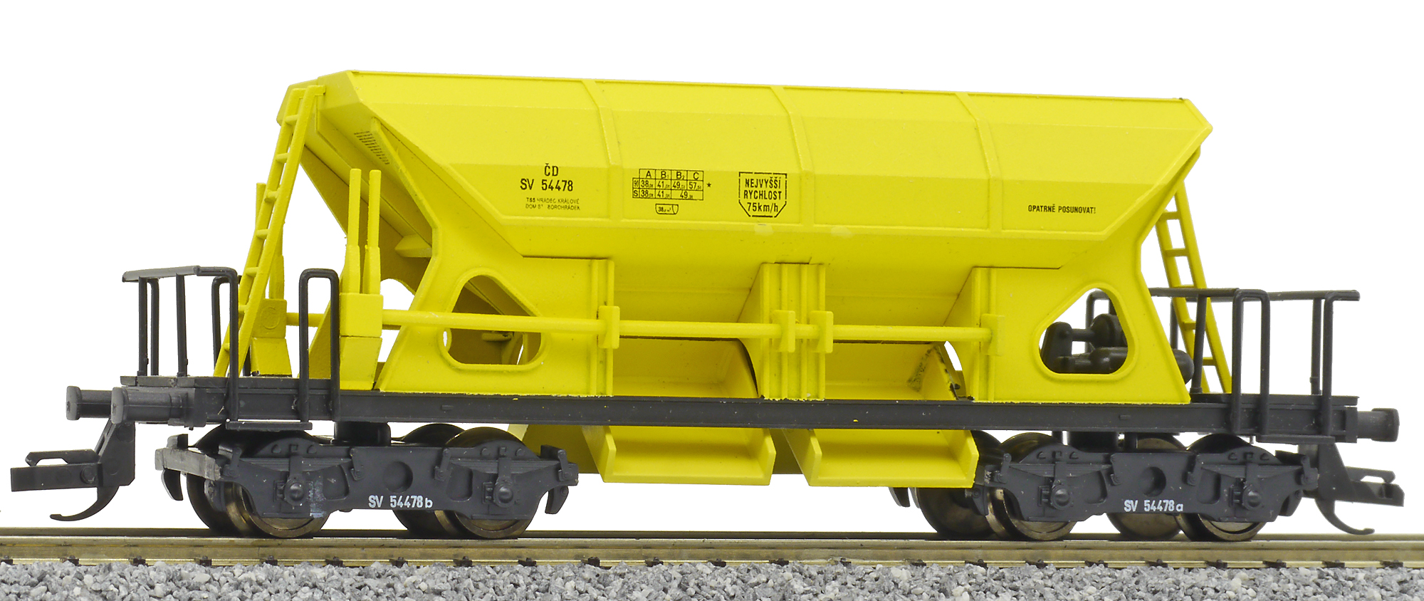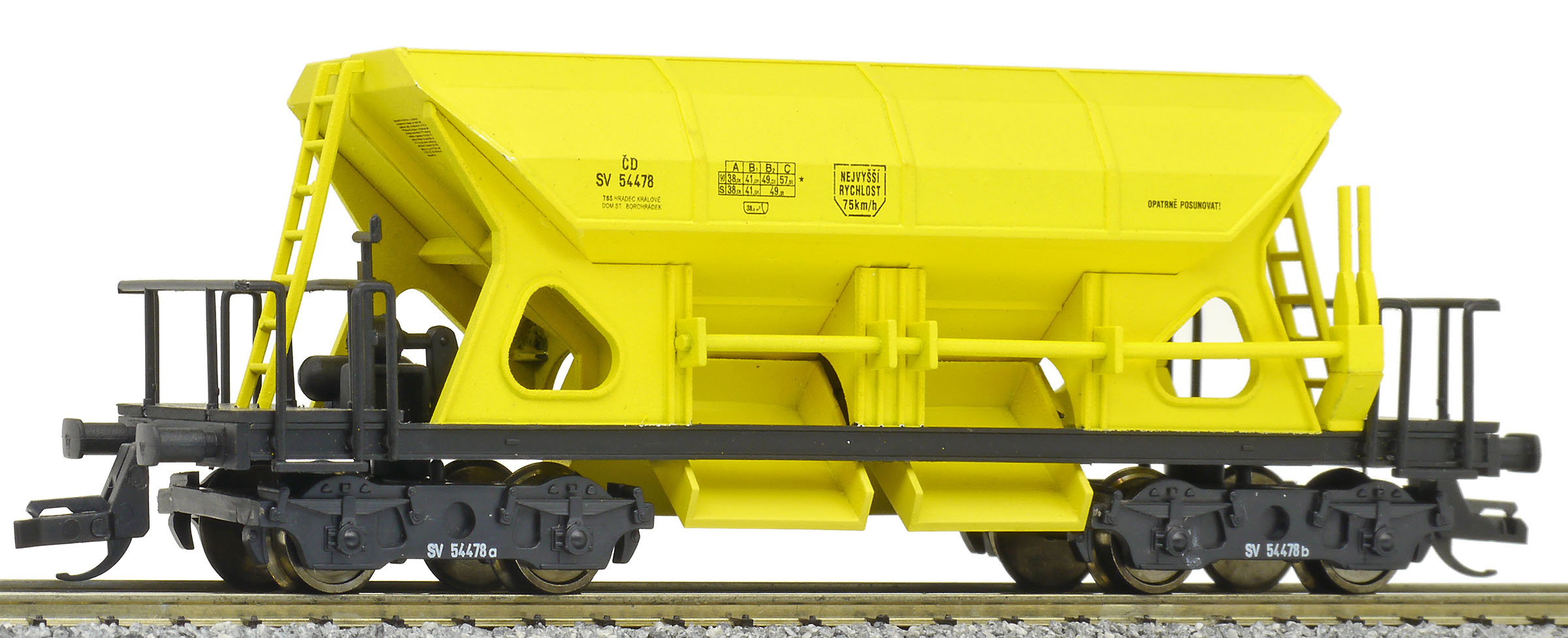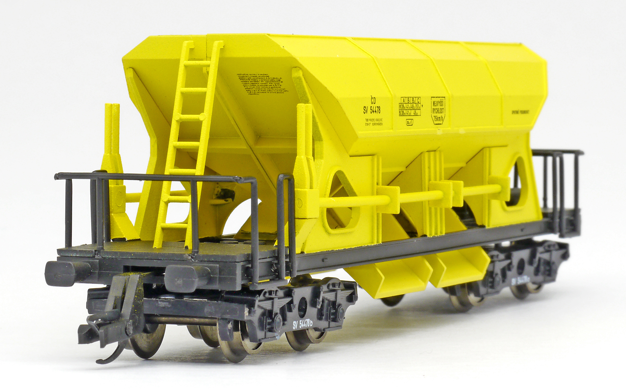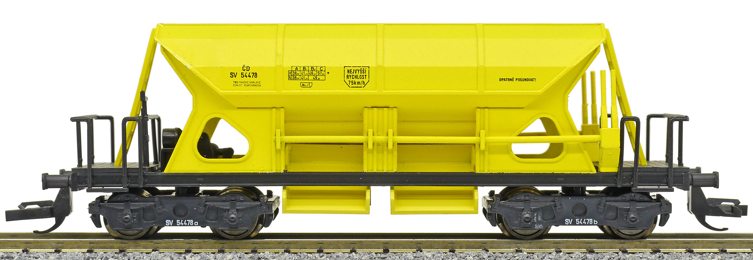 nákladní samovýsypný pracovní vůz žlutý s černým rámem a podvozky