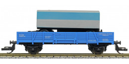 | nízkostěnný nářaďový vůz modrý s nákladem maringotky „Elektrizace železnic“ |