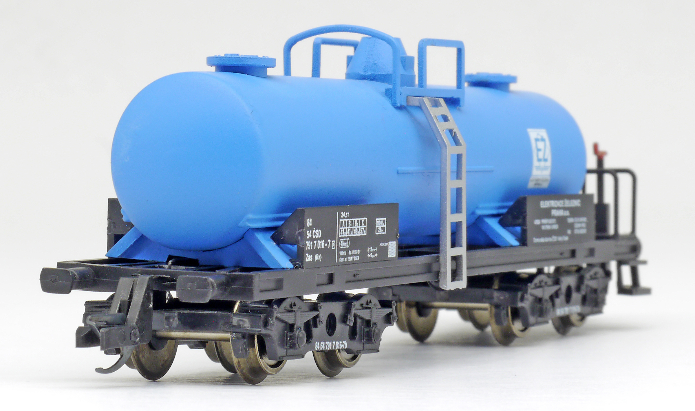 | kotlový vůz modrý s černým pojezdem „Elektrizace železnic“ |