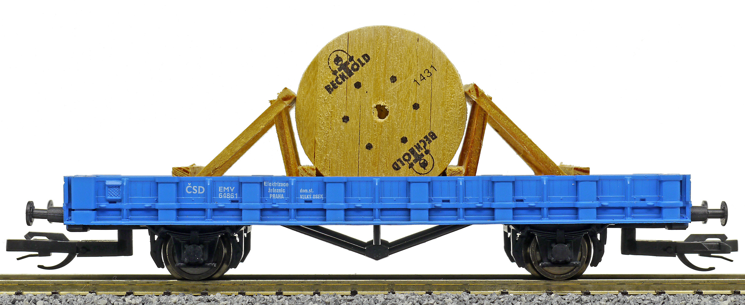 | nízkostěnný nákladní vůz modrý s nákladem bubnu kabelu „Elektrizace železnic“ |