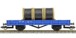 | nízkostěnný nákladní vůz modrý s nákladem tří bubnů kabelů „Elektrizace železnic“ |