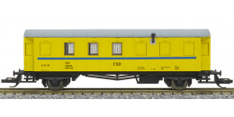 | dílenský vůz žlutý modrým proužkem a šedou střechou |