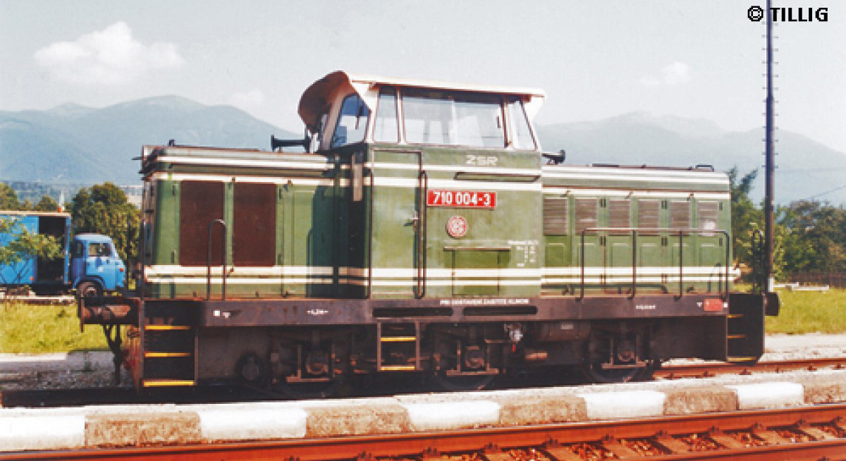 dieselová lokomotiva zelený s bílými proužky, černý rám a pojezd