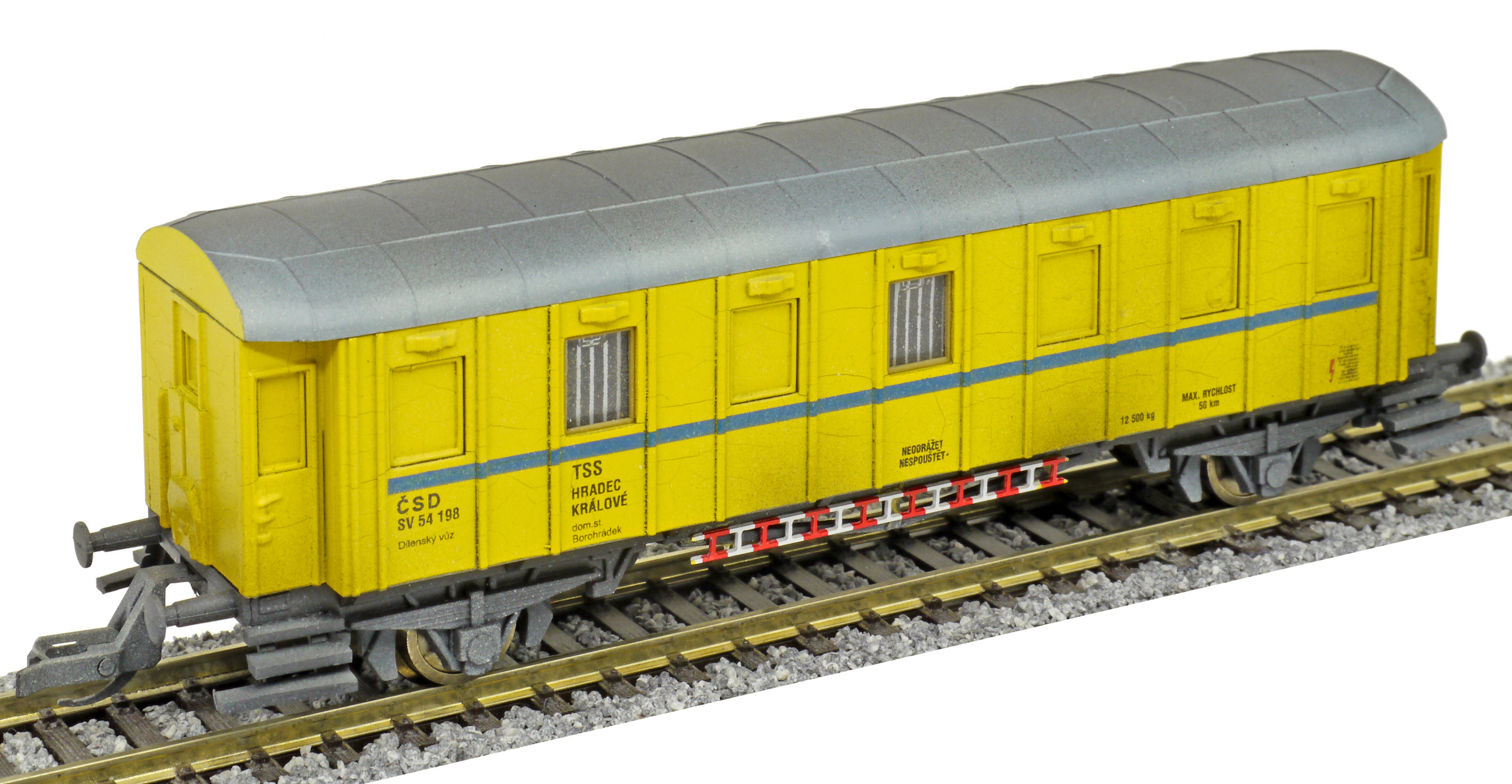 měřítko 1:120 - rozchod kolejí 12 mm nenormované uchycení spřáhla 116 mm - celková délka modelu přes nárazníky 2 - celkový počet náprav nebo rozložení náprav 51 g - hmotnost brutto - model včetně prodejního obalu 28 g - hmotnost netto - pouze model
