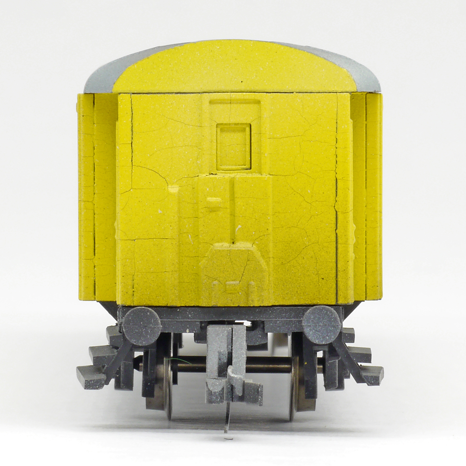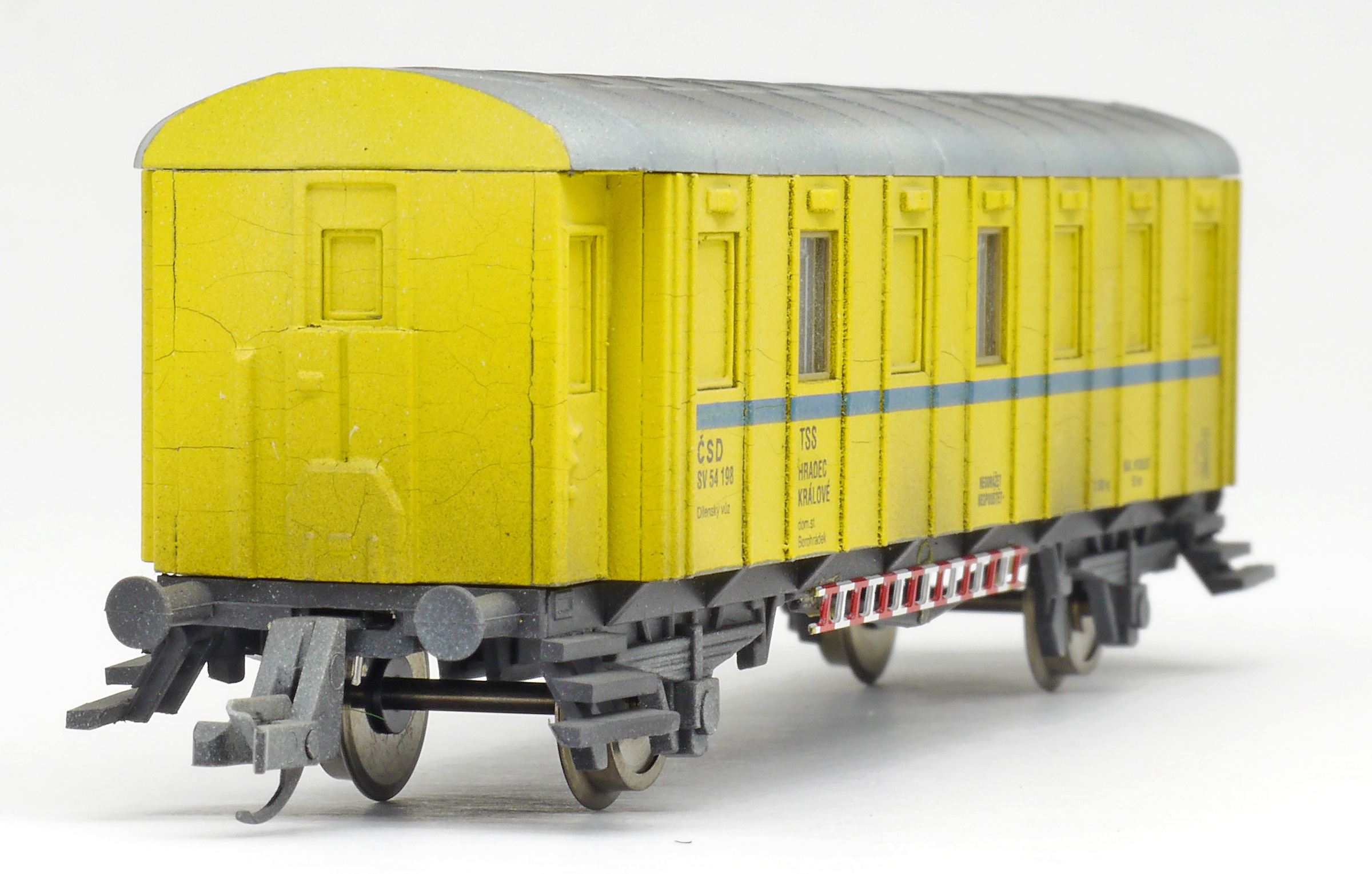 | dílenský vůz žlutý s modrým proužkem a šedou střechou |