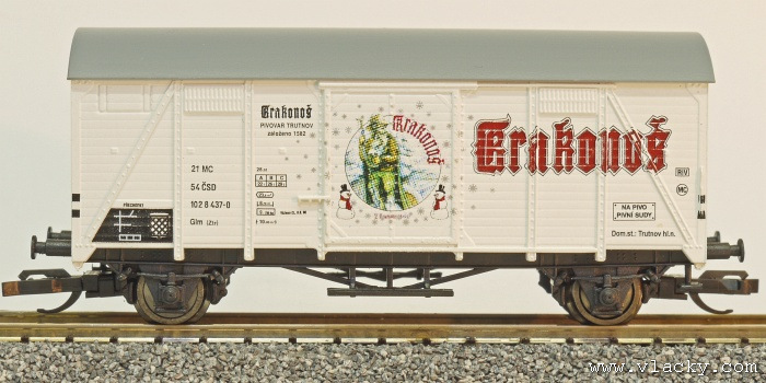 | krytý nákladní vůz bílý s šedou střechou „Krakonoš”, zimní motiv |