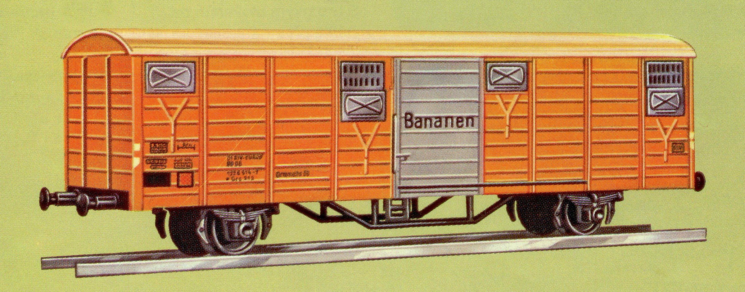 | krytý nákladní vůz oranžový s krémovou střechou a s šedými vraty „Bananen“ |