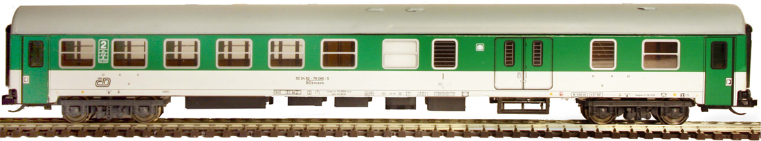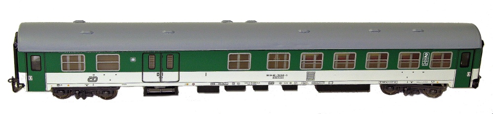 | rychlíkový vůz zelený-bílý s šedou střechou se zavazadlovým oddílem, 2. tř. |