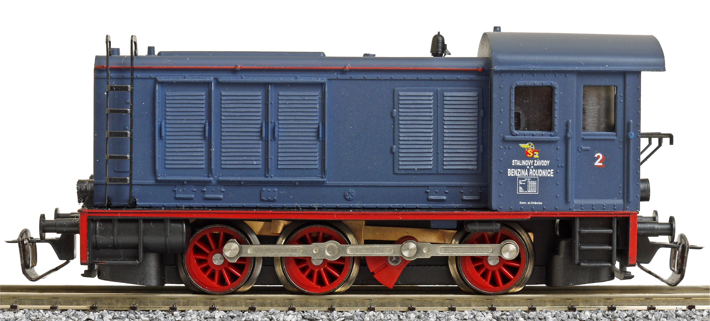 | dieselová lokomotiva tmavě modrá s červeno-černým rámem „Stalinovy závody“ |