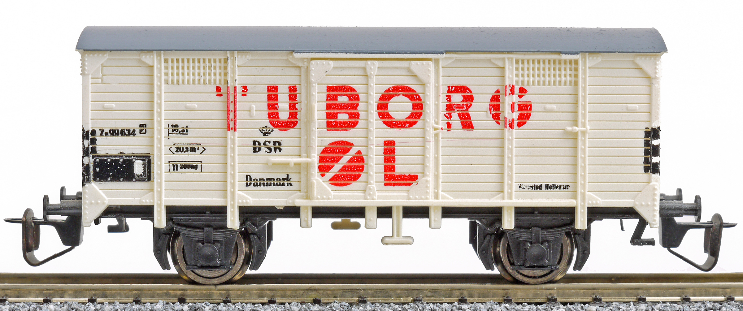 krytý nákladní vůz bílý s šedou střechou „TUBORG ØL“