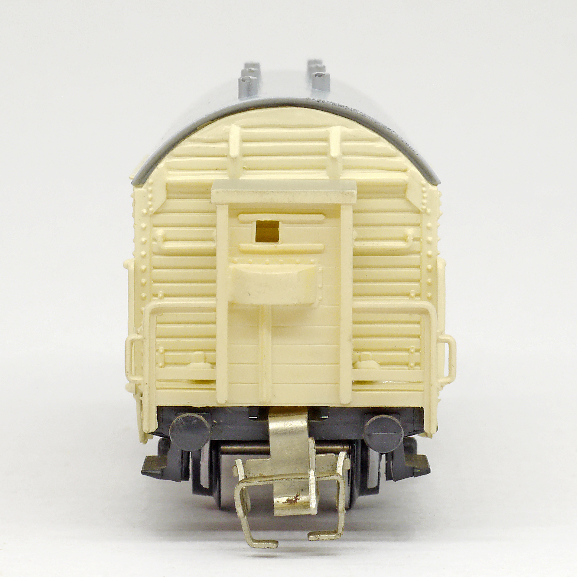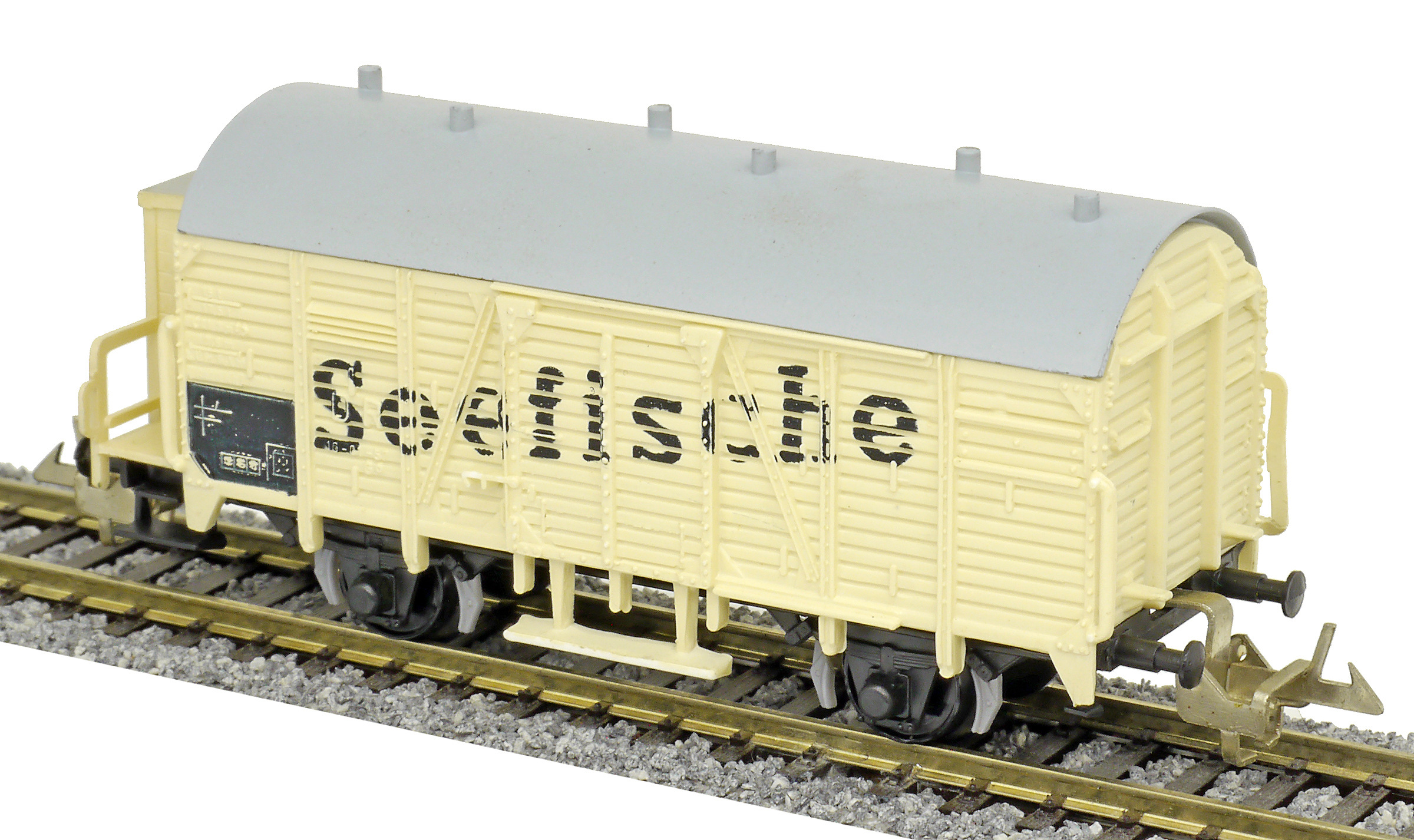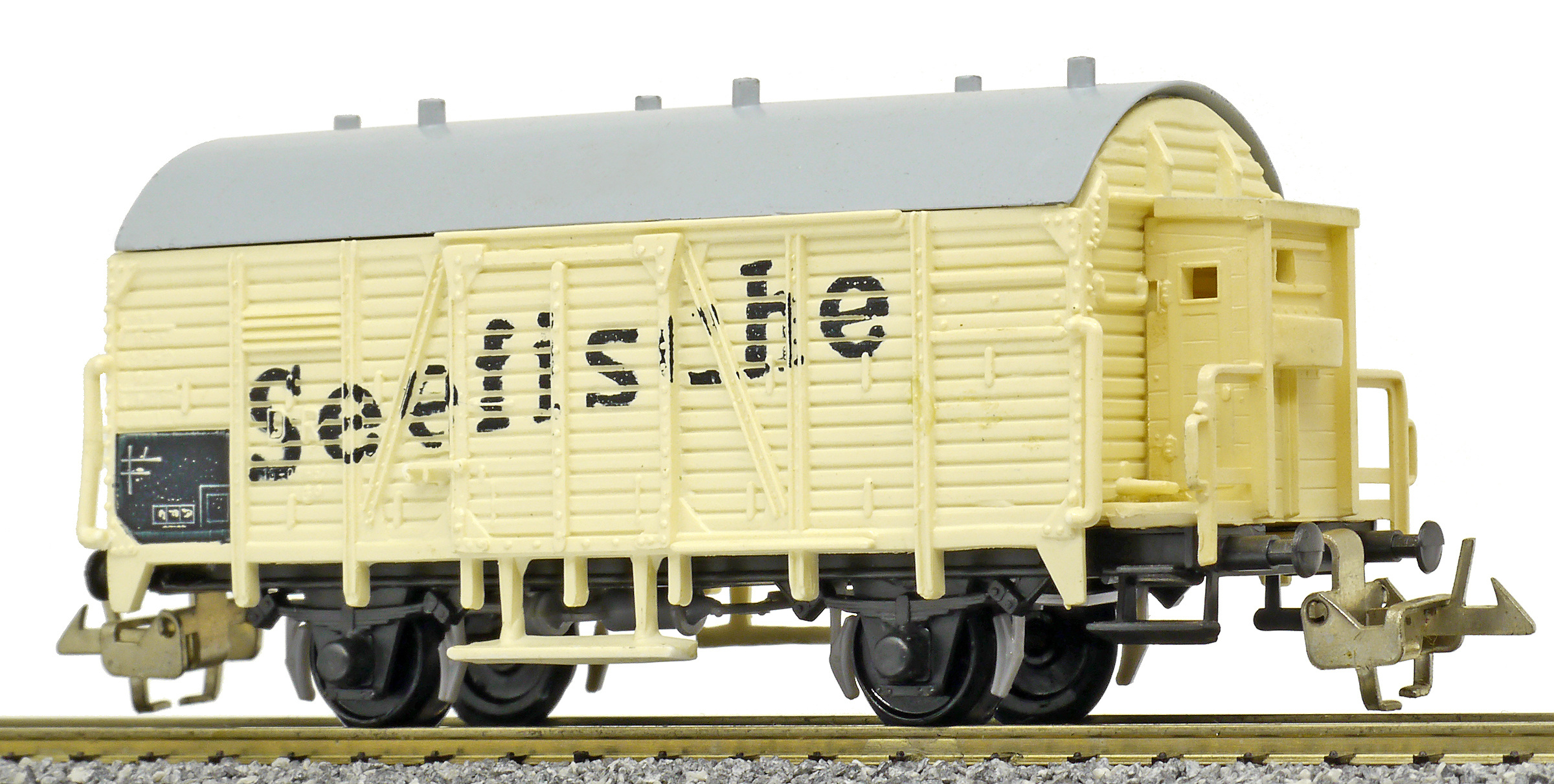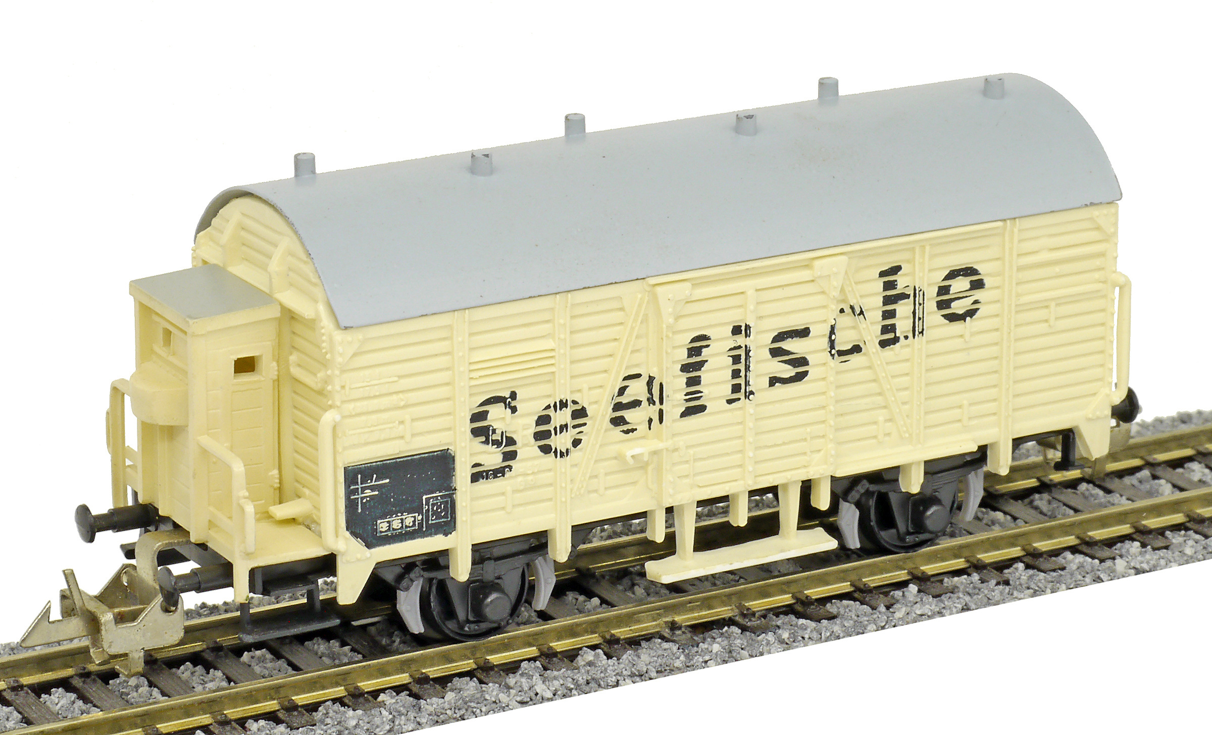 | nákladní chladící vůz krémový s šedou střechou a brzdařskou budkou „Seefische“ |