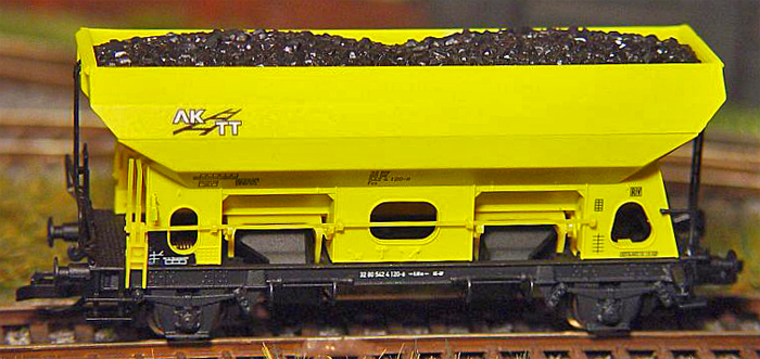 | nákladní samovýsypný vůz žlutý s nákladem uhlí |