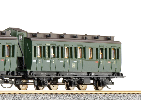 | oddílový osobní vůz zelený s černou střechou a brzdařskou budkou 2. tř. |