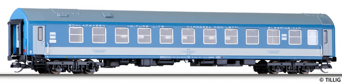 | lůžkový vůz modrý se světle šedým pásem a s šedou střechou |