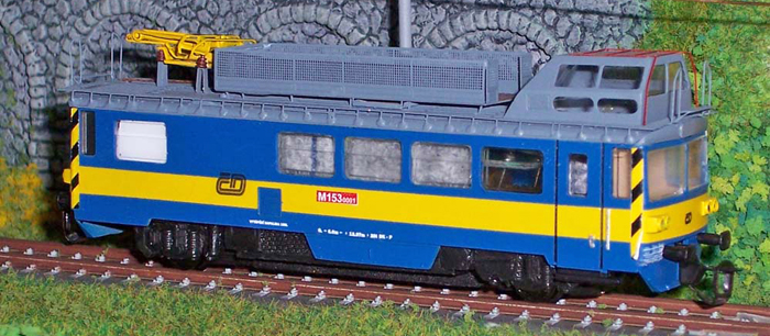 motorový vůz na opravu vrchního vedení modrý s výstražným žlutým pruhem