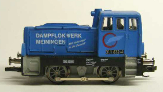 dieselová lokomotiva modrá s černým rámem a pojezdem, vlečková „AW Meiningen“