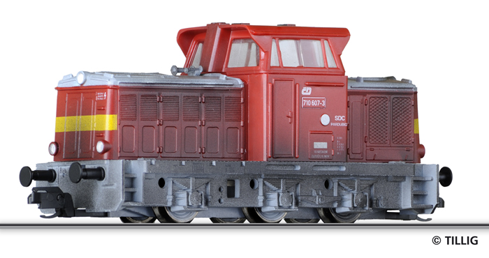 dieselová lokomotiva červená se žlutým výstražným pruhem