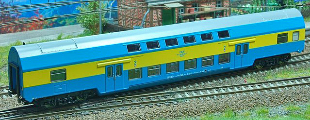 středový patrový vůz modrý se žlutým pásem a šedou střechou 2. tř.