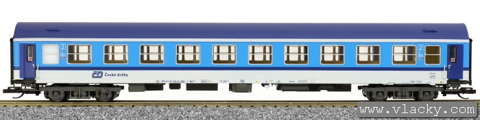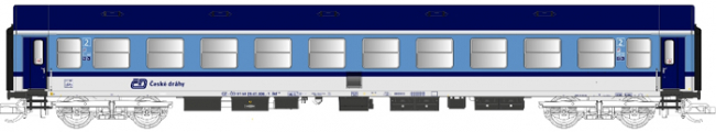 Popis   rychlíkový vůz modrý-bílý v barevném chematu „Najbrt“ 2. tř.