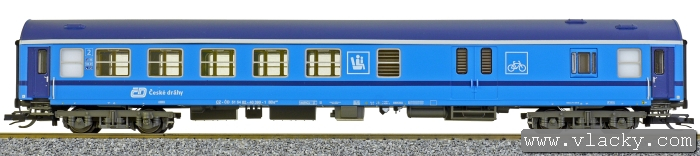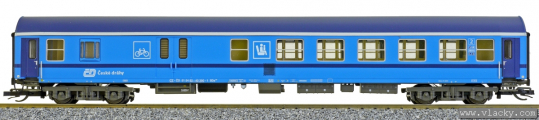 rychlíkový vůz modrý-bílý v barevném chematu „Najbrt“ 2. tř. se služebním oddílem