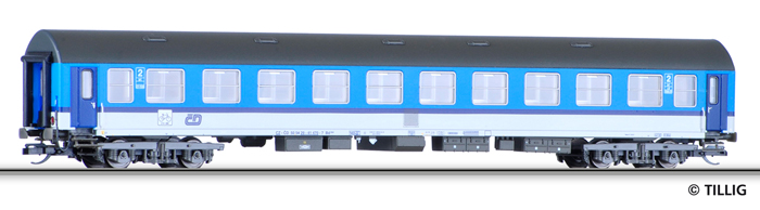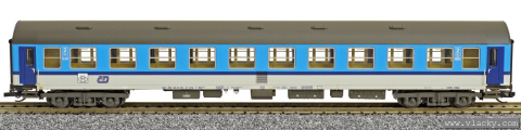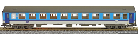 | rychlíkový vůz modrý-bílý v barevném chematu „Najbrt“ 2. tř. s oddílem na kola |