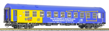 | lůžkový vůz modrý-žlutý s reklamním potiskem |