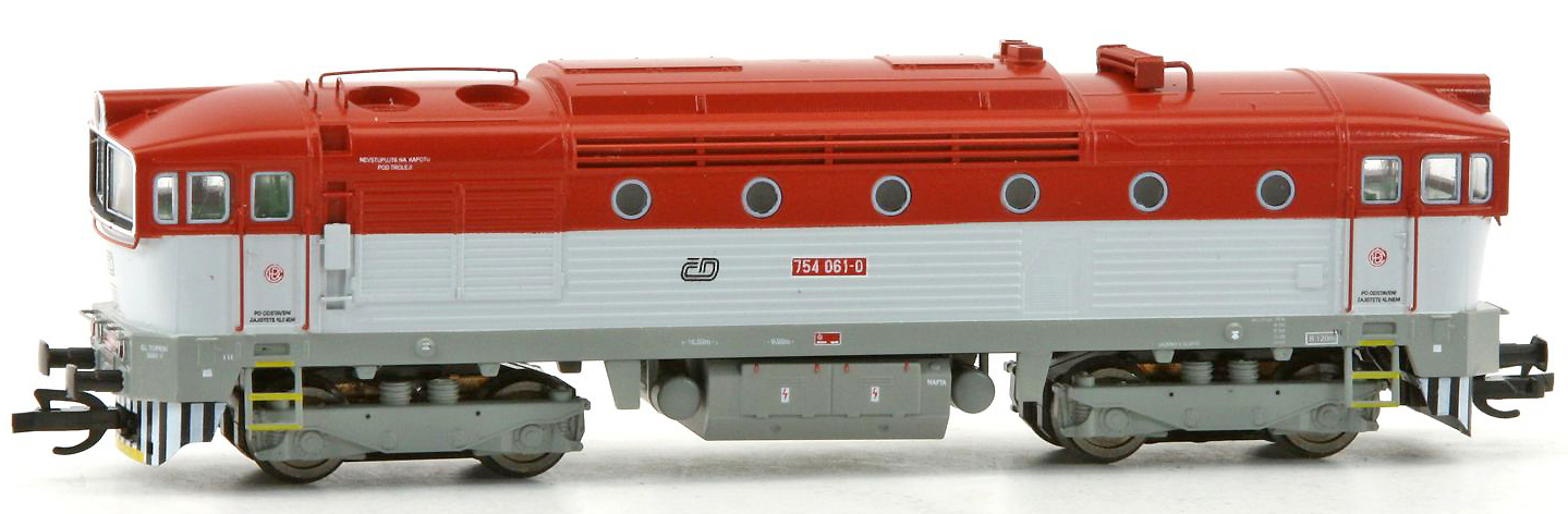 Popis   dieselová lokomotiva červená-bílá se světlešedým pojezdem