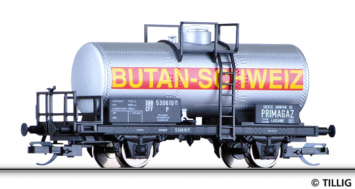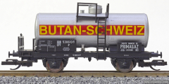 stříbrná s červeným pásem a žlutým nápisem „BUTAN-SCHWEIZ“