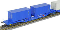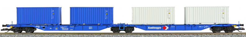 | dvoudílný kontejnerový vůz modrý „Kombiwaggon“ se čtyřmi kontejnery 20' |