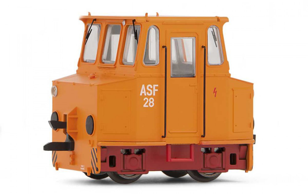 Popis   oranžová akumulátorová posunovací lokomotiva