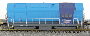| dieselová lokomotiva světle modrá-tmavě modrá s tmavě šedým rámem a pojezdem |