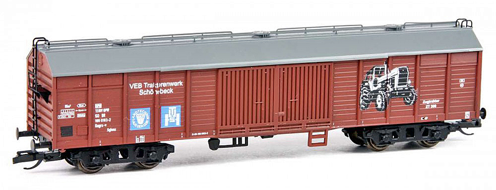 | krytý vůz červenohnědý s šedou střechou „Traktorenwerk“ |