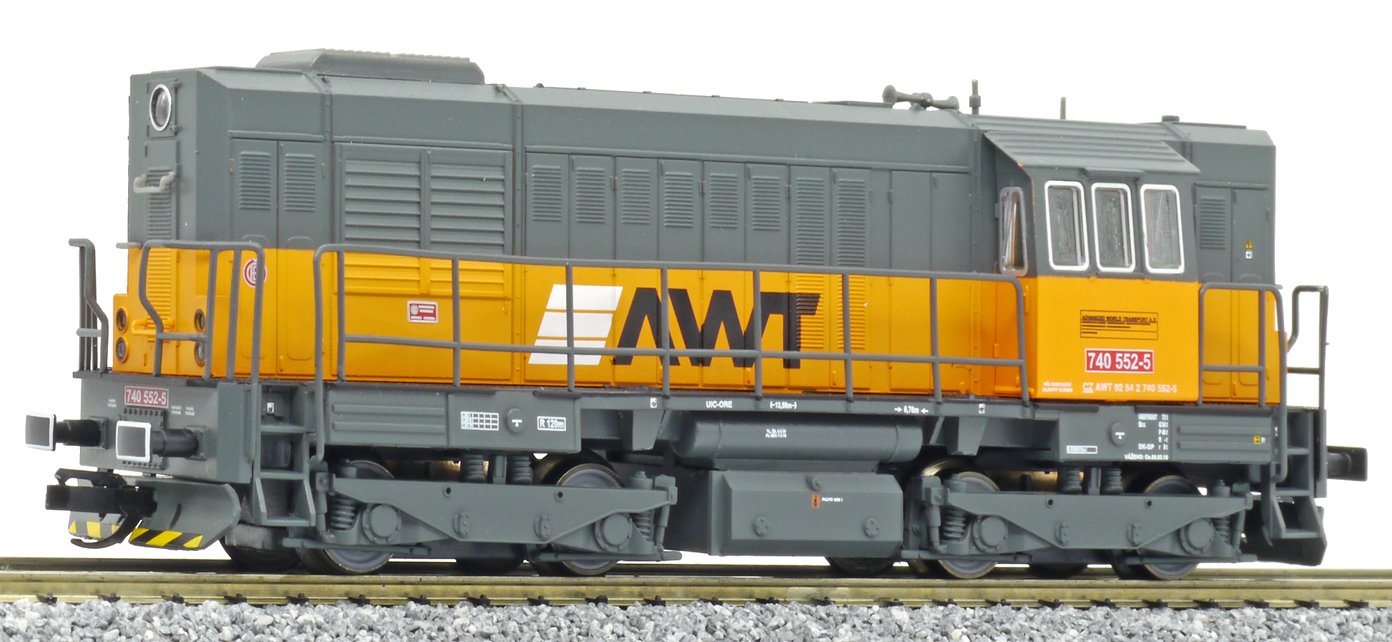 | dieselová lokomotiva šedá s oranžovým pásem a logem „AWT“ |