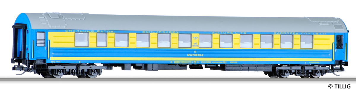 | lůžkový vůz modrý-žlutý s šedou střechou |