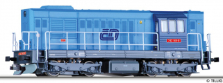 | dieselová lokomotiva modrá, tmavě modrá budka, černý rám a pojezd |