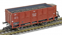 | otevřený nákladní vůz červenohnědý s nákladem uhlí |