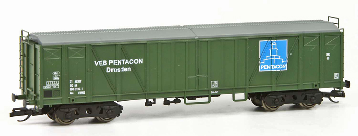 | krytý nákladní vůz zelený s reklamou „PENTACON“ |