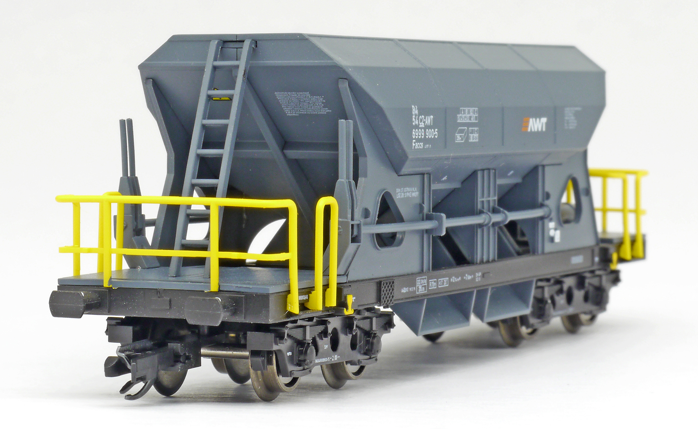 | nákladní samovýsypný vůz šedý, černý rám a žluté zábradlí |