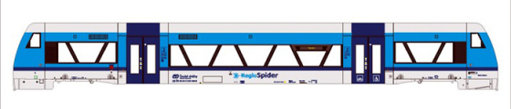 | motorový vůz v barevném schematu „Najbrt“ s logem „RegioSpider“ |