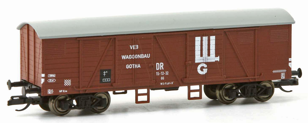 | krytý nákladní vůz červenohnědý s šedou střechou „Waggonbau Gotha“ |