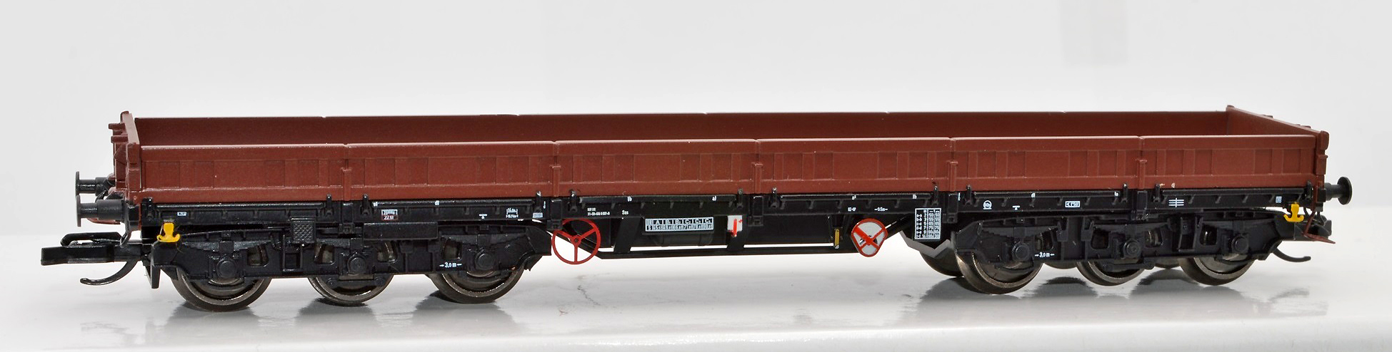| nízkostěnný nákladní vůz červenohnědý s černým rámem |