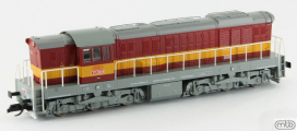 | dieselová lokomotiva červená s výstražným pruhem, šedá střecha, rám a pojezd |