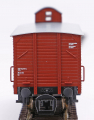 | krytý nákladní vůz červenohnědý s šedou střechou a s brzdařskou budkou |