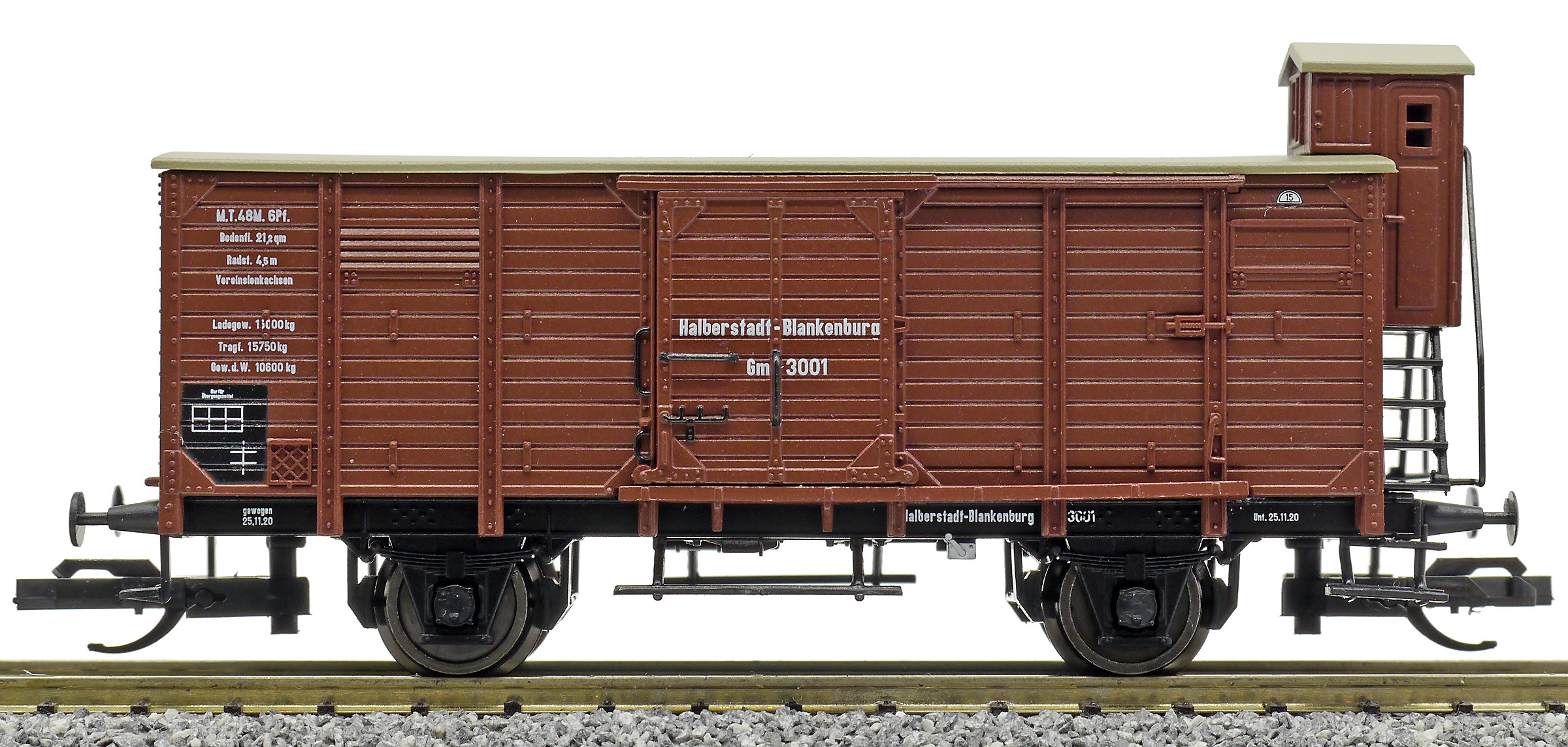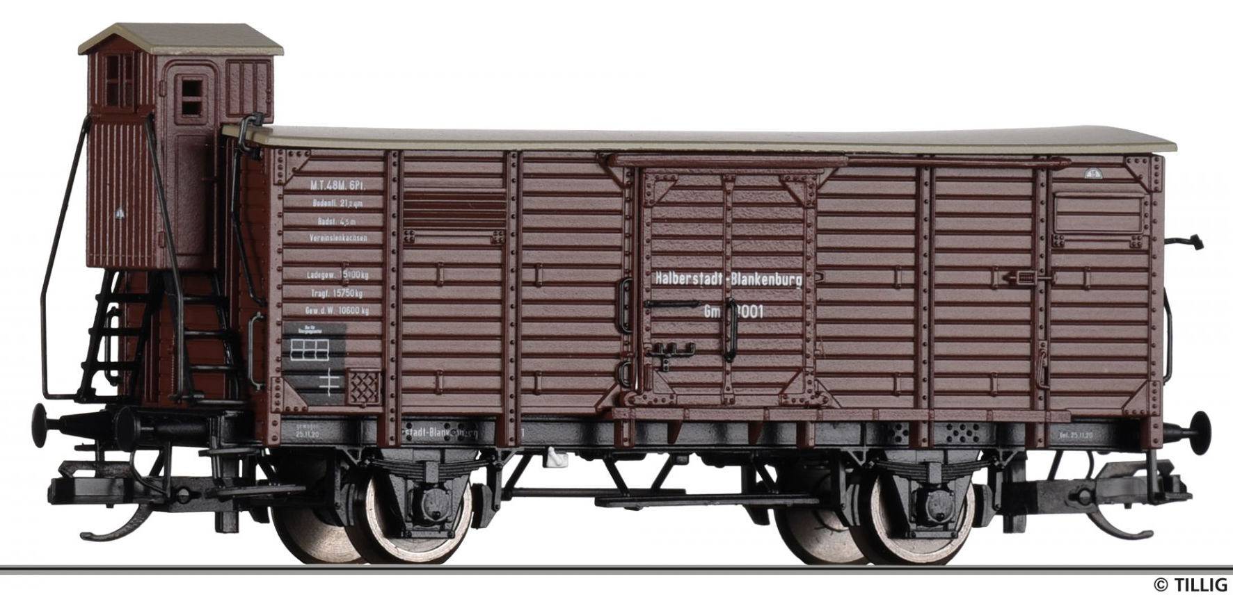 krytý nákladní vůz hnědý s černou střechou a s brzdařskou budkou