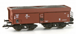 | nákladní samovýsypný vůz červenohnědý s nákladem hnědého uhlí |