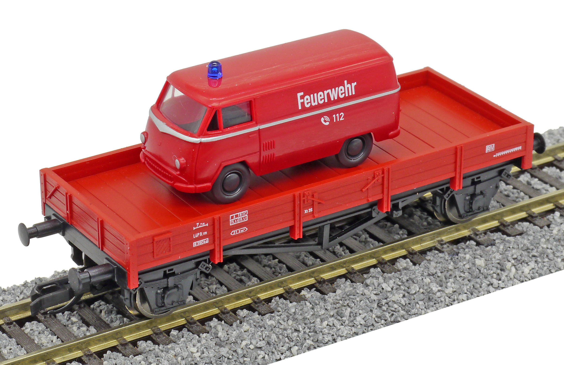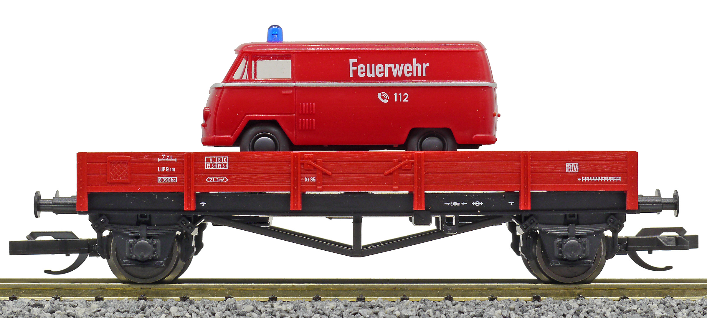 | nízkostěnný nákladní vůz červený ložený dodávkou Matador do požárního vlaku |