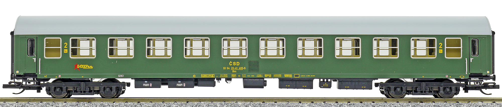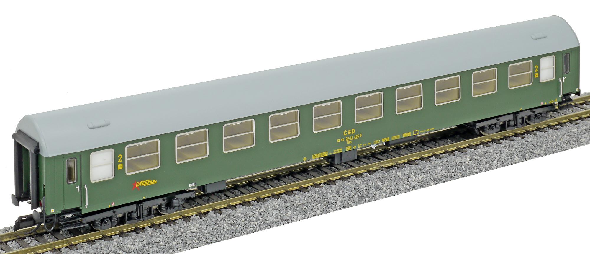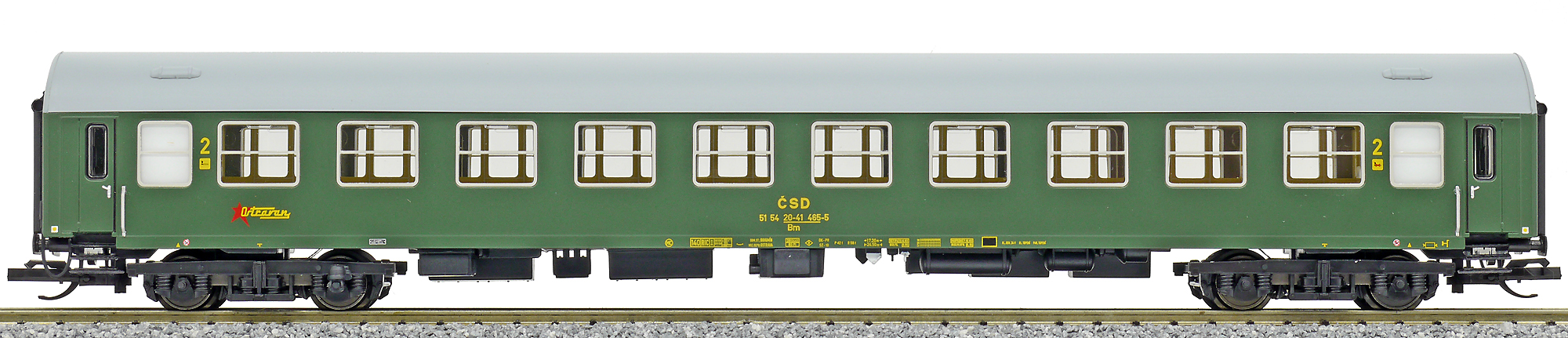 | rychlíkový vůz zelený s šedou střechou 2. tř. „Ostravan“ |