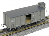 krytý nákladní vůz zelenošedý s černou střechou a s brzdařskou budkou
